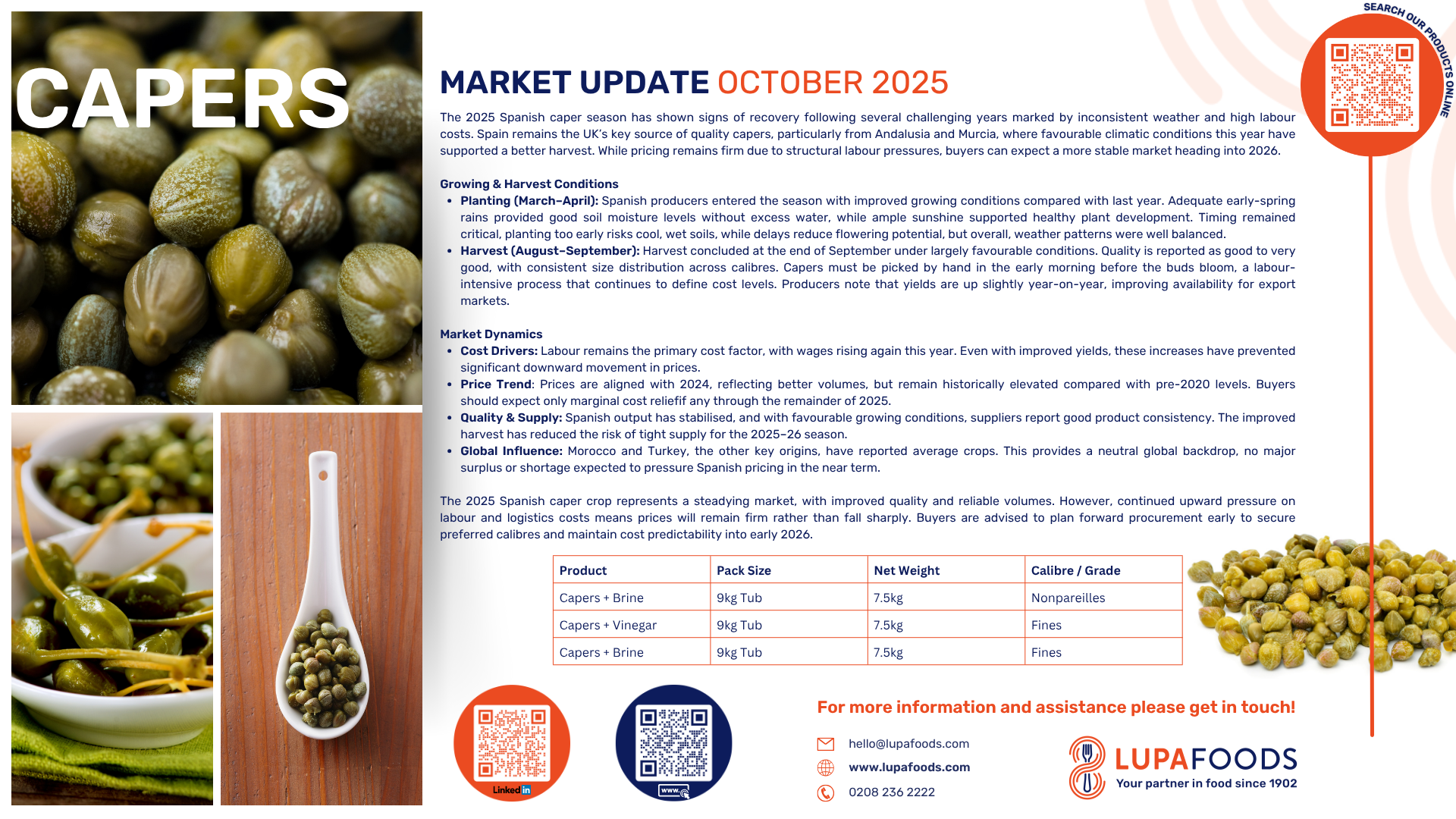 The 2025 Spanish caper crop represents a steadying market, with improved quality and reliable volumes. However, continued upward pressure on labour and logistics costs means prices will remain firm rather than fall sharply. Buyers are advised to plan forward procurement early to secure preferred calibres and maintain cost predictability into early 2026.