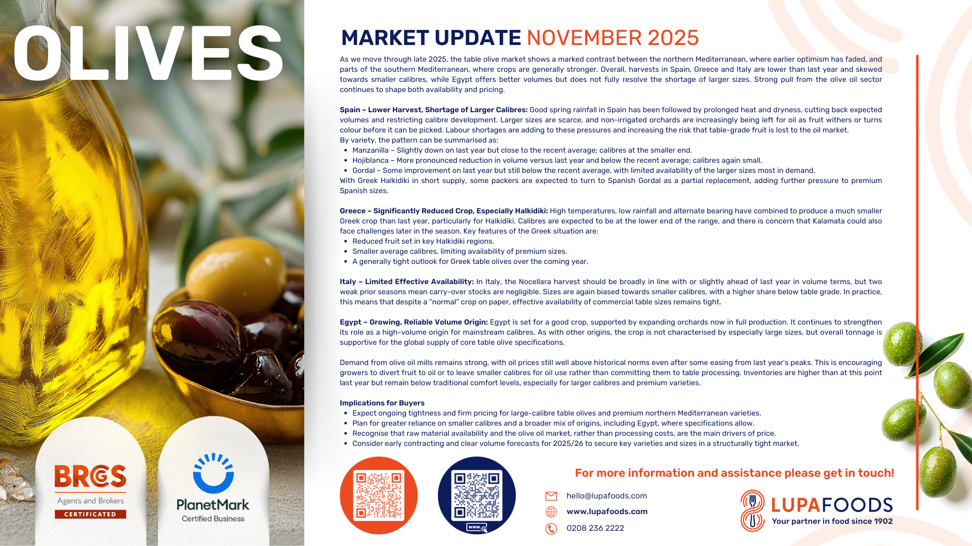 As we move through late 2025, the table olive market shows a marked contrast between the northern Mediterranean, where earlier optimism has faded, and parts of the southern Mediterranean, where crops are generally stronger. Overall, harvests in Spain, Greece and Italy are lower than last year and skewed towards smaller calibres, while Egypt offers better volumes but does not fully resolve the shortage of larger sizes. Strong pull from the olive oil sector continues to shape both availability and pricing.