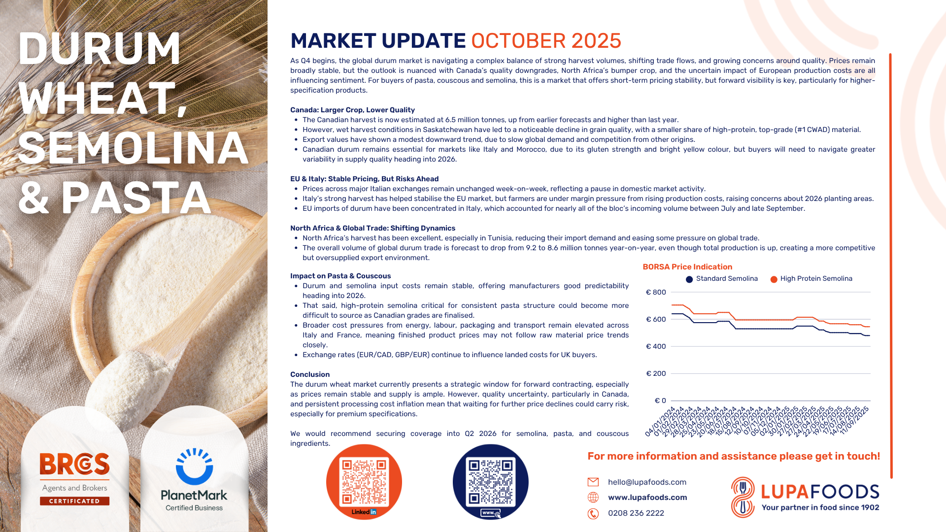 As Q4 begins, the global durum market is navigating a complex balance of strong harvest volumes, shifting trade flows, and growing concerns around quality. Prices remain broadly stable, but the outlook is nuanced with Canada’s quality downgrades, North Africa’s bumper crop, and the uncertain impact of European production costs are all influencing sentiment. For buyers of pasta, couscous and semolina, this is a market that offers short-term pricing stability, but forward visibility is key, particularly for higher-specification products.
