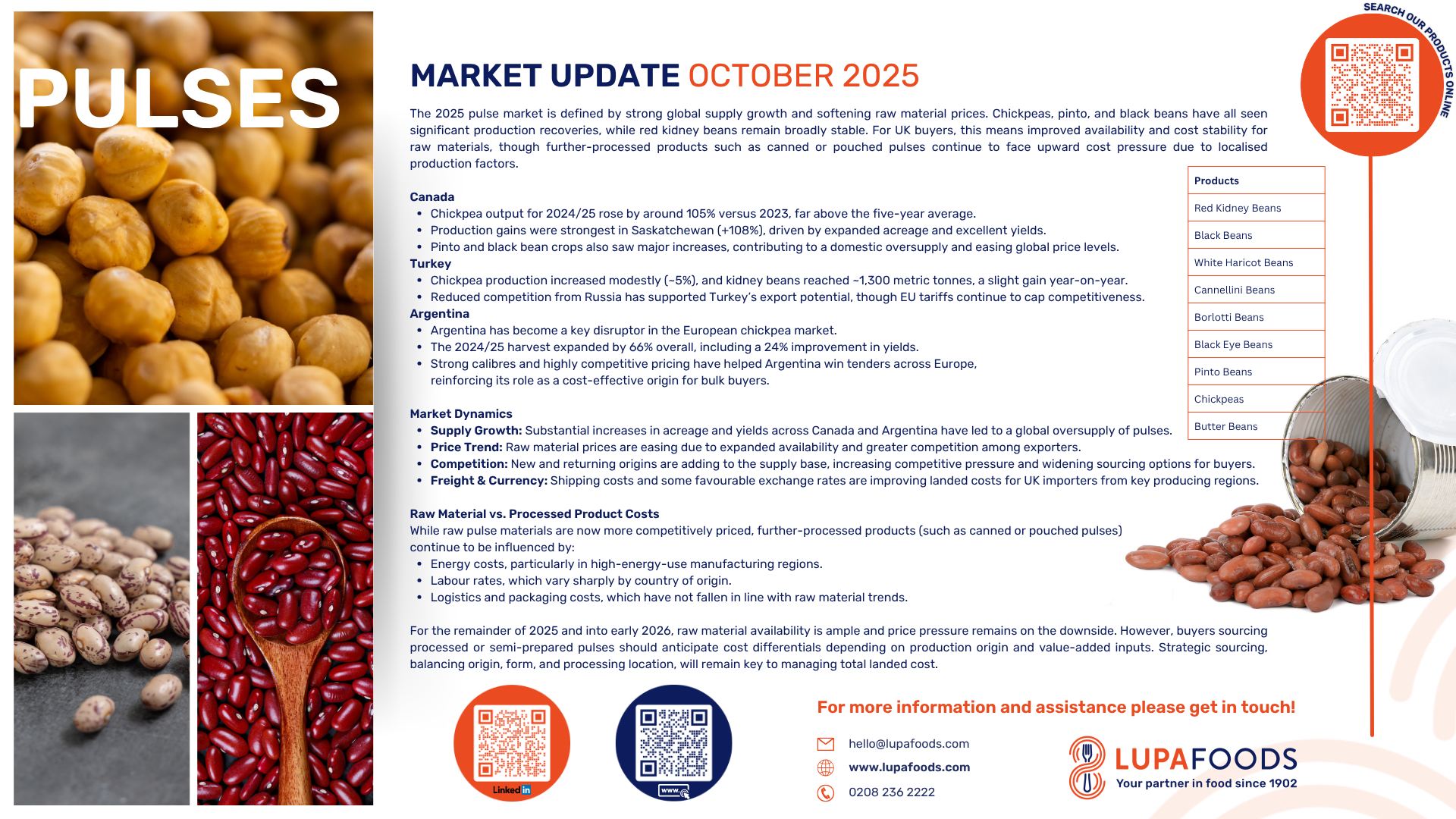 The 2025 pulse market is defined by strong global supply growth and softening raw material prices. Chickpeas, pinto, and black beans have all seen significant production recoveries, while red kidney beans remain broadly stable. For UK buyers, this means improved availability and cost stability for raw materials, though further-processed products such as canned or pouched pulses continue to face upward cost pressure due to localised production factors.